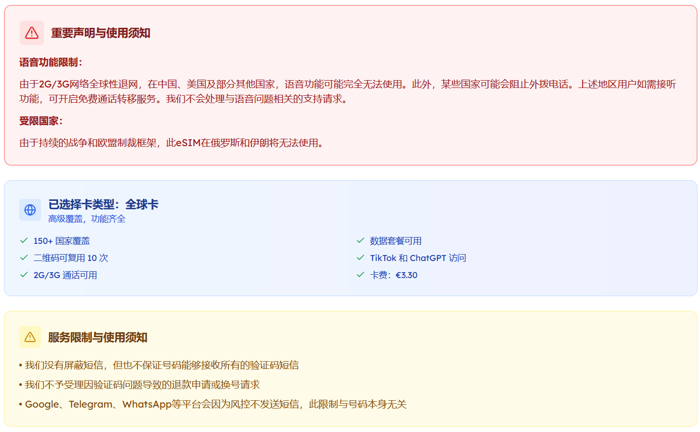 - 只有纯流量套餐,没有支持语音和短信的套餐